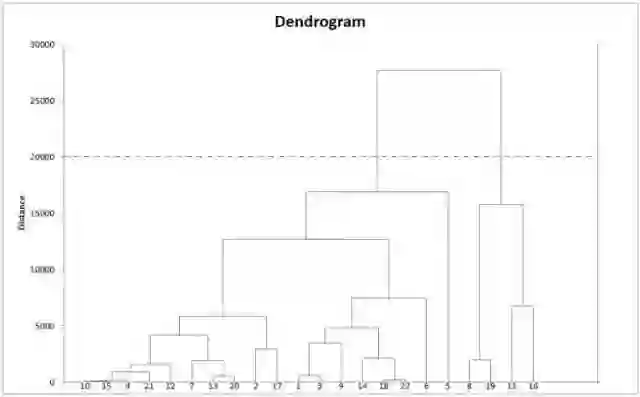 选择一个聚类数量,然后在这个树状图中划一条水平线。比如说,如果你想要 K=2 个聚类,你应该在距离大约为 20000 的位置画一条水平线,你会得到一个包含数据点 8、9、11、16 的聚类和包含其它数据点的另一个聚类。一般而言,你得到的聚类的数量就是水平线与树状图中的竖直线的交叉点的数量。