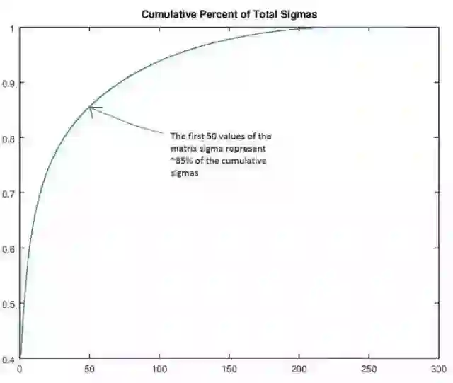 http://andrew.gibiansky.com/blog/mathematics/cool-linear-algebra-singular-value-decomposition/。首先,我们发现如果我们根据大小排序这些奇异值(矩阵 Σ 的值),那么前 50 个奇异值将包含整个矩阵 Σ 的大小的 85%。