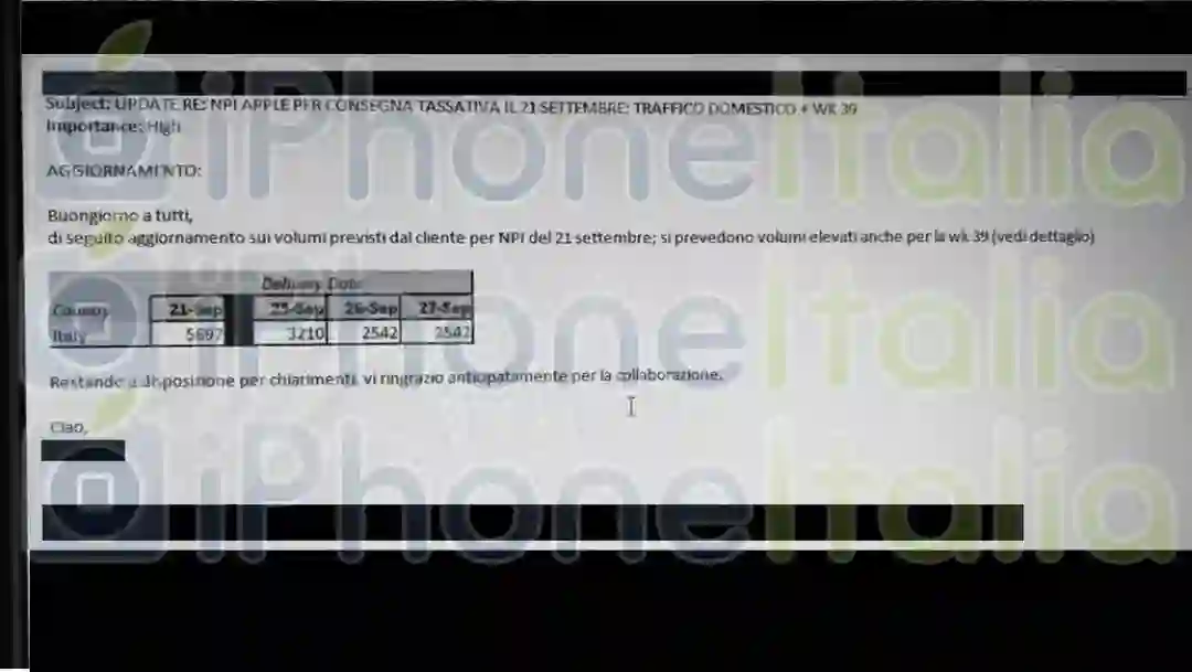 Apple Insider 已确认,DHL 是苹果在意大利和许多其他国家的运输合作伙伴在意大利。该截图还警告说,9 月 25 日到 9 月 27 日的交付量会有所增加,但是预计不会高于 9 月 21 日的峰值。