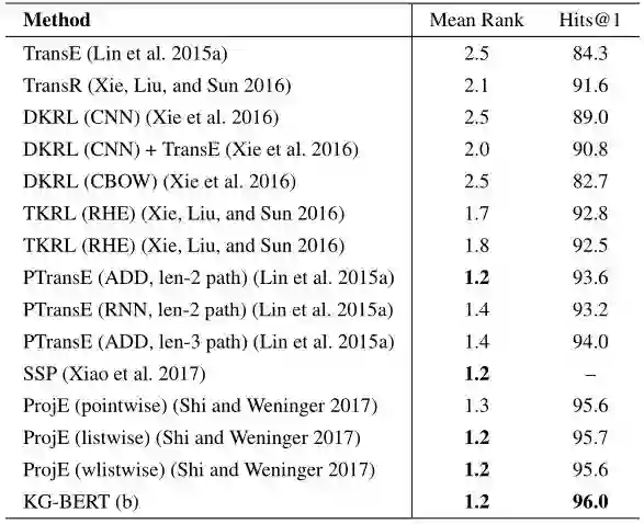 KG-BERT(a)表现良好的主要原因有四个方面:1)输入序列同时包含实体和关系词序列;2)三元组分类任务与BERT 预训练中的下一个句子预测任务非常相似,在大的自由文本中捕捉两个句子之间的关系,因此预训练的BERT权值很好地用于推断三元组中不同元素之间的关系;3)标记隐藏向量是上下文嵌入。同一标记在不同的三元组中可以有不同的隐藏向量,因此上下文信息能够准确使用。4)自注意机制可以挖掘出与三元组事实相关的最重要的词。