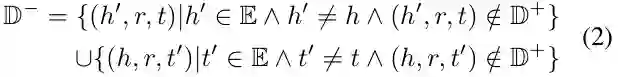 其中,y_t属于{0,1}是三元组的标签(正例或者负例)。负三元组集合D_-是通过将正三元组集合中的头实体或者尾实体随机替换为其他的实体h_'或者t_'生成的,即: