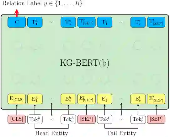 用于预测关系的KG-BERT的体系结构如图2所示。我们将这个KG- BERT版本命名为KG-BERT(b)。我们只用两个实体h和t的句子来预测它们之间的关系r。在我们的初步实验中,我们发现直接预测与两个实体的关系要优于使用关系损坏的KG-BERT(a),即通过将关系r随机替换为r_'生成负三元组。对于KG-BERT(a),会将与[CLS]对应的最终隐藏状态C作为两个实体的表示。在关系预测的微调中唯一引入的新参数是分类层权重W_'属于R_RxH,其中R是在一个KG中关系的的数目。对于一个给定三元组t=(h,r,t)得分函数是s_t'=f(h,r,t)=softmax(CW_T'),s_t'属于R_R是一个R维的实向量且s_ti'属于[0,1]和s_t1'+s_t2'+...s_tR'=1。我们可以计算带有s_ti’和三元组标签的交叉熵损失: