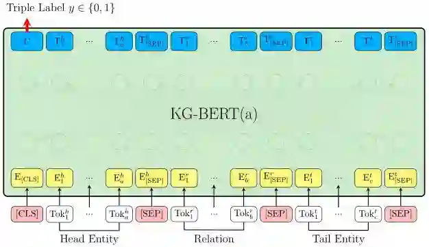 用于对三元组建模的KG-BERT结构是如图1所示。我们将这个KG- BERT版本命名为KG- BERT(a)。对于给定的标记,通过对相应的标记、分割和位置嵌入求和来构造其输入表示。由[SEP]分隔的不同元素具有不同的分割嵌入。头尾实体句中的标记共享同一分割嵌入e_A,但是对于关系语句的标记拥有不同的分割嵌入e_B。对于同一位置i的不同标记拥有相同的位置嵌入。每一个输入标记i都有一个输入表示E_i。然后将这些标记表示全部输进BERT模型结构。特殊[CLS]标记和第i个输入标记的最终的隐藏向量分别表示为C属于R_H和T_i属于R_H,其中H为预训练BERT中的隐藏状态的大小。采用[CLS]对应的最终隐藏状态C作为计算三元组分数的聚合序列表示。在三元组分类微调唯一引入的新参数是分类层权重W属于R_2xH。对于一个三元组的得分函数t=(hr,t)是s_t=f(h,r,t)=sigmoid(CW_T),其中,s_t属于R_2,是一个2维的实向量且s_t0,s_t1属于[0,1],s_t0 + s_t1=1。对于给定的正三元组集合D_+和构建相对应的负三元组集合D_-,我们可以计算带有s_t和三元组标签的交叉熵损失: