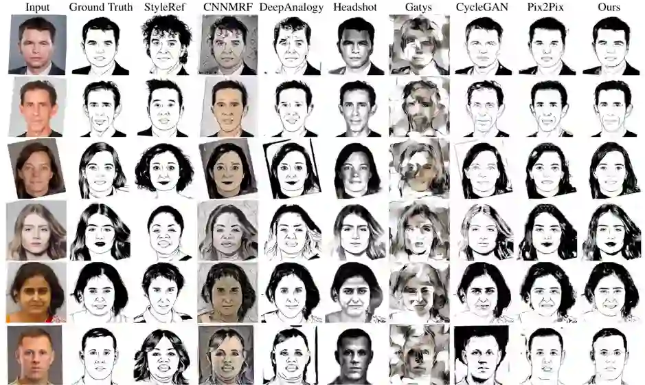第一列是人脸照片,第二列是艺术家画的肖像画,第三列是一些方法需要的风格参考图,第四至九列是其他方法的结果,最后一列是我们方法的结果。