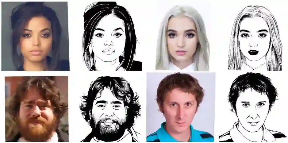 图1. 一些人脸照片和对应的艺术家画的肖像线条画。