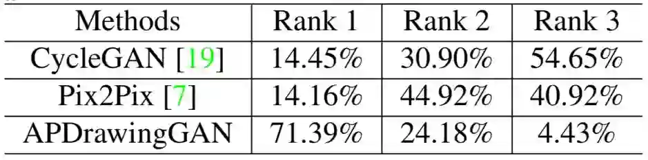 73名参与者参与了用户研究。用户研究中,每位参与者每次从两种算法生成的肖像画中选择一幅更接近艺术家肖像画和图像质量更好的肖像画,并对三种方法(CycleGAN、Pix2Pix和我们的方法)两两进行了比较,由此我们得到了三种方法的排名。