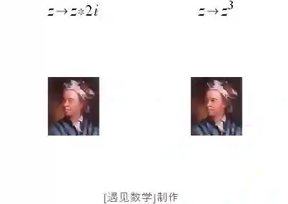 如果对图片中的每一点做复数运算的变换, 可以得到各种有趣的平面变换图像. 这里为了纪念欧拉大神, 就以他老人家头像为例, 比如做乘以 2 i 的函数变换 - 旋转 90°, 同时放大了2 倍的变换; 另一个变换函数为三次方, 你也可以思考为什么会变成这个形状呢? :-)