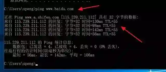 这里我们ping一下百度,看看我们的网络是否联通,从图上看来回用了56毫秒,丢包数为0,网络质量很好