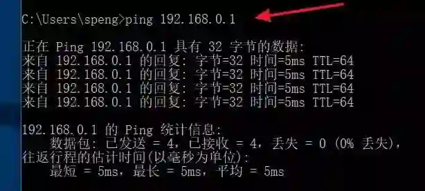 这里我们ping我们自己的网关,可以检查路由器与电脑直接网络的连接,如果ping不通我们就要重点看一路由器有没有设置对。