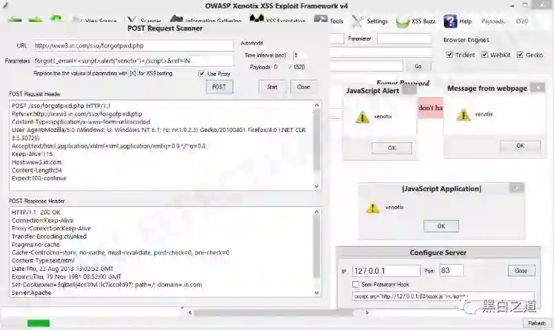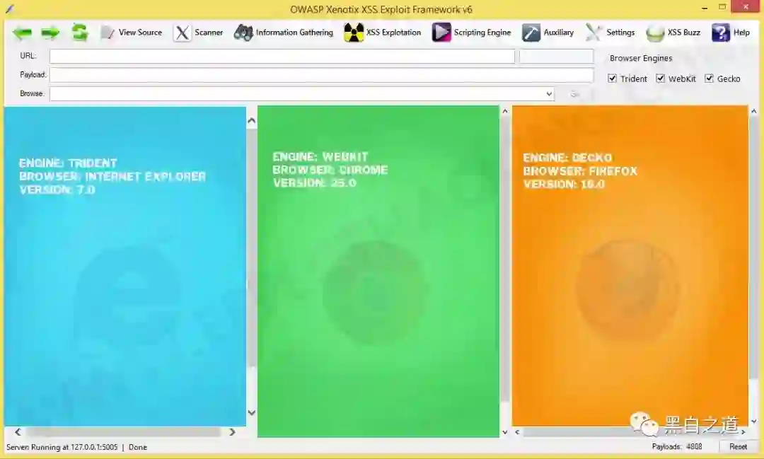 Xenotix是一个先进的开源Cross Site Scripting(XSS)漏洞检测和利用框架。它利用其独特的三重浏览器引擎(Trident,WebKit和Gecko)嵌入式扫描仪提供零假正扫描结果