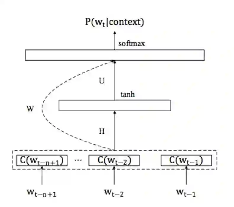 图 1:Bengio 等人于 2003 年提出的 FFNNLM。