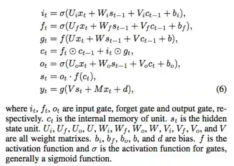 其中,i_t,f_t,o_t 分别代表输入门、遗忘门和输出门。c_t 是单元的内部记忆状态。s_t 是隐藏状态单元。U_i、U_f、U_o、U、W_i、W_f、W_o、W、V_i、V_f、V_o 以及 V 都是权值矩阵。b_i、b_f、b_o、b 以及 d 是偏置。f 是激活函数,σ 是各个门的激活函数(通常为 sigmoid 函数)。