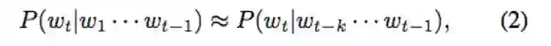 考虑到很难对上述模型中超多的参数进行学习,有必要采取一种近似方法。N 元(N-gram)模型是一种最为广泛使用的近似方法,并且在 NNLM 出现之前是最先进的模型。一个(k+1)元模型是由 k 阶马尔科夫假设推导出的。该假设说明当前的状态仅仅依赖于前面的 k 个状态,即: