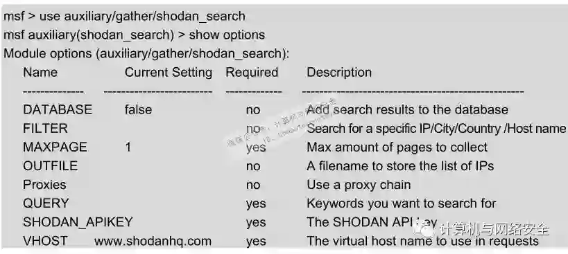(6)选择auxiliary/gather/shodan_search模块,并查看该模块下可配置的选项参数。执行命令如下所示: