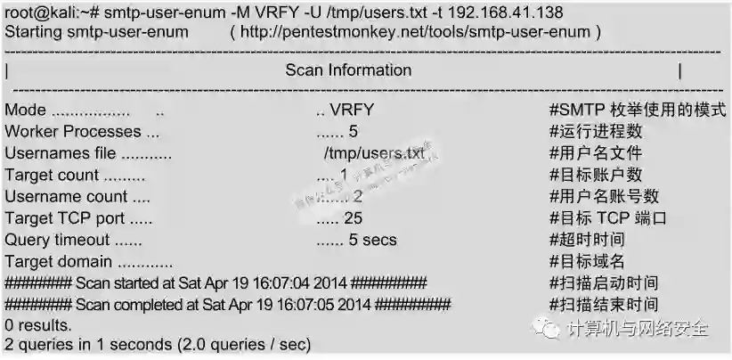 smtp-user-enum是针对SMTP服务器的25端口,进行用户名枚举的工具,用以探测服务器已存在的邮箱账户。在SMTP服务上启动用户的SMTP枚举。执行命令如下所示: