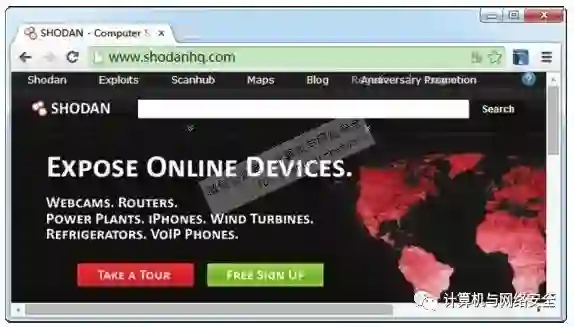 Shodan的官网网址是www.shodanhq.com。打开该网址界面,如图5所示。