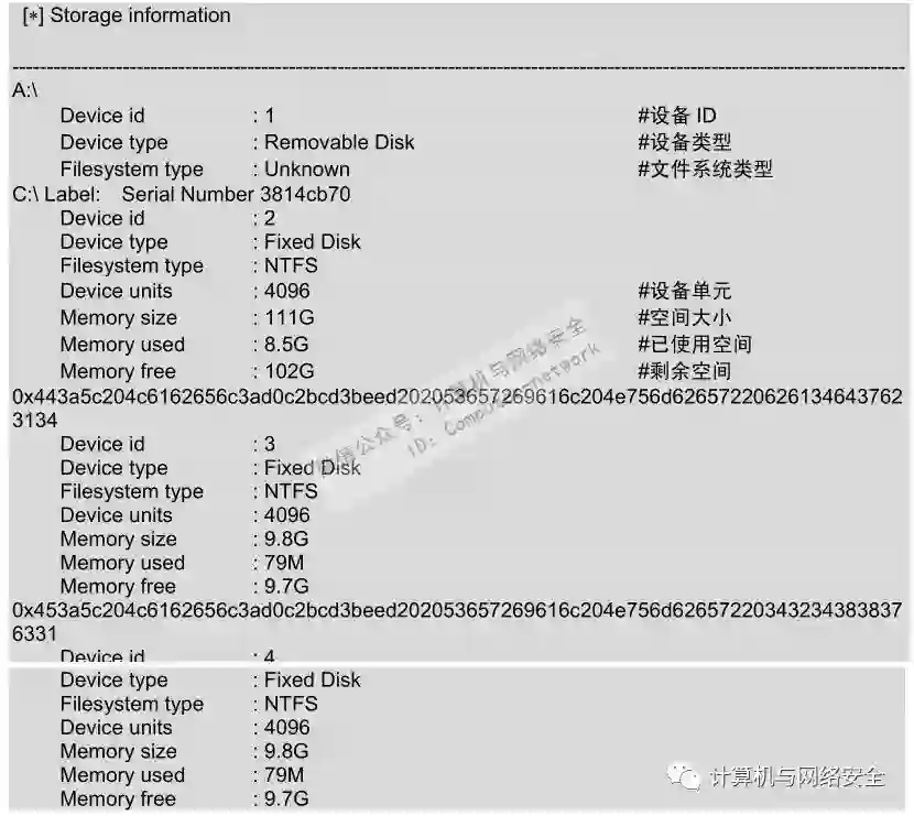 (3)获取存储信息,如设备id、设备类型和文件系统类型等。结果如下所示: