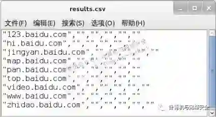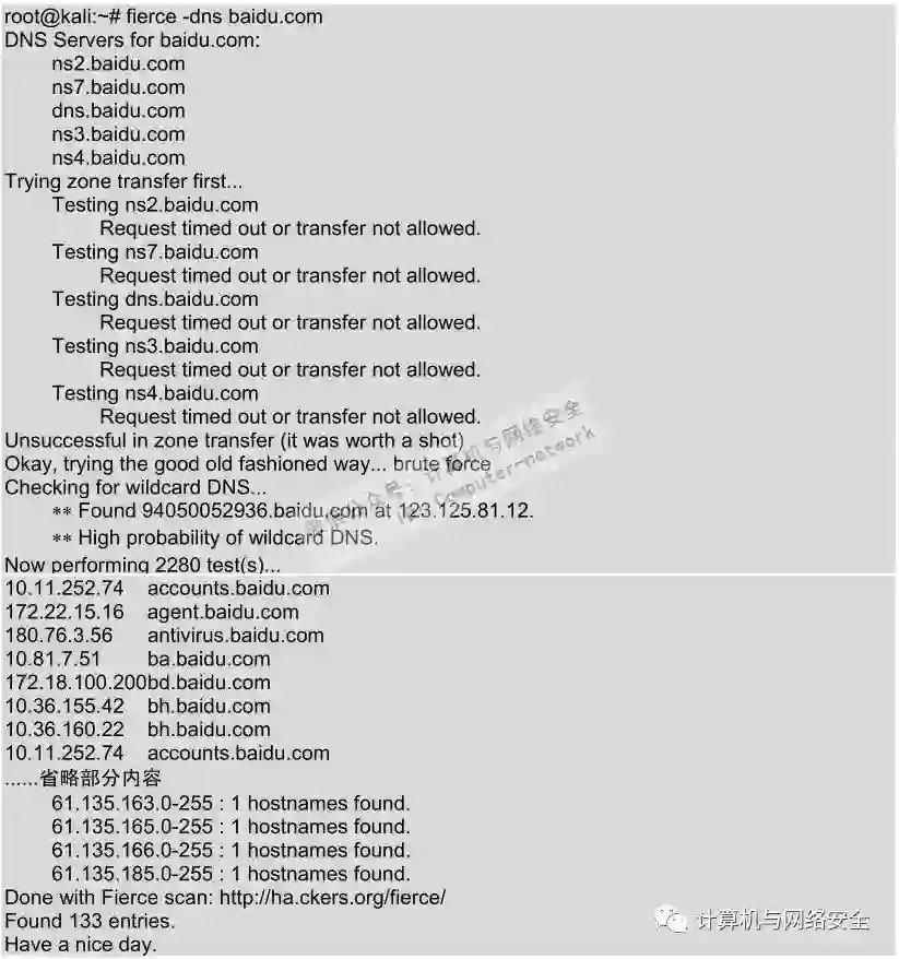 输出的信息显示了 baidu.com 下所有的子域。从倒数第2行,可以看到总共找到133个条目。执行以上命令后,输出的内容较多。但是由于篇幅的原因,部分内容使用省略号(......)取代。