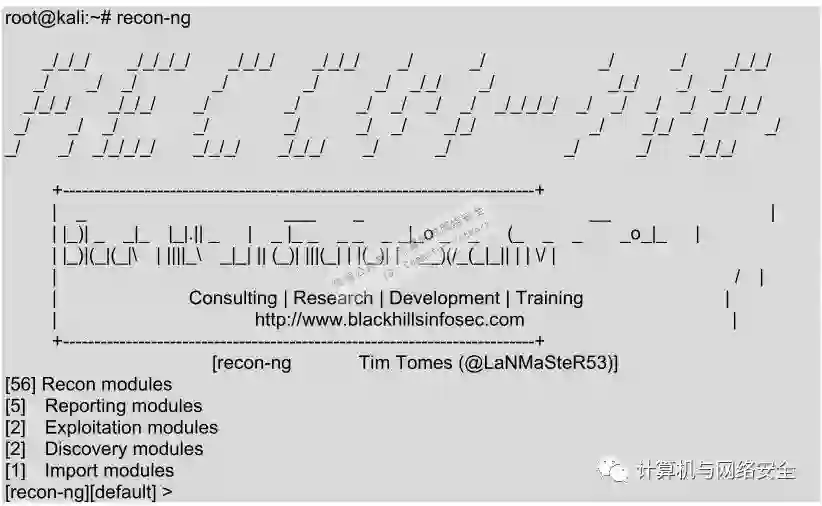 以上输出信息显示了Recon-NG框架的基本信息。例如,在Recon-NG框架下,包括56个侦查模块、5个报告模块、2个渗透攻击模块、2个发现模块和1个导入模块。看到[recon-ng][default] >提示符,表示成功登录Recon-NG框架。现在,就可以在[recon-ng][default]>提示符后面执行各种操作命令了。