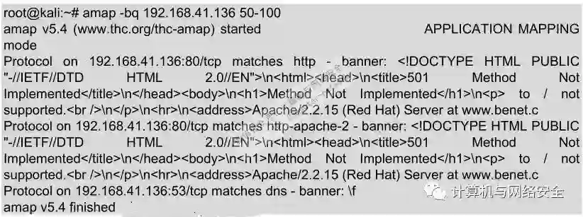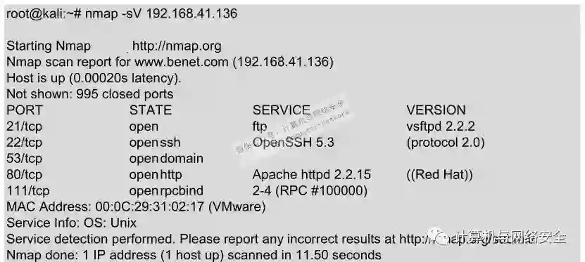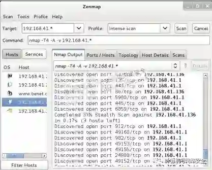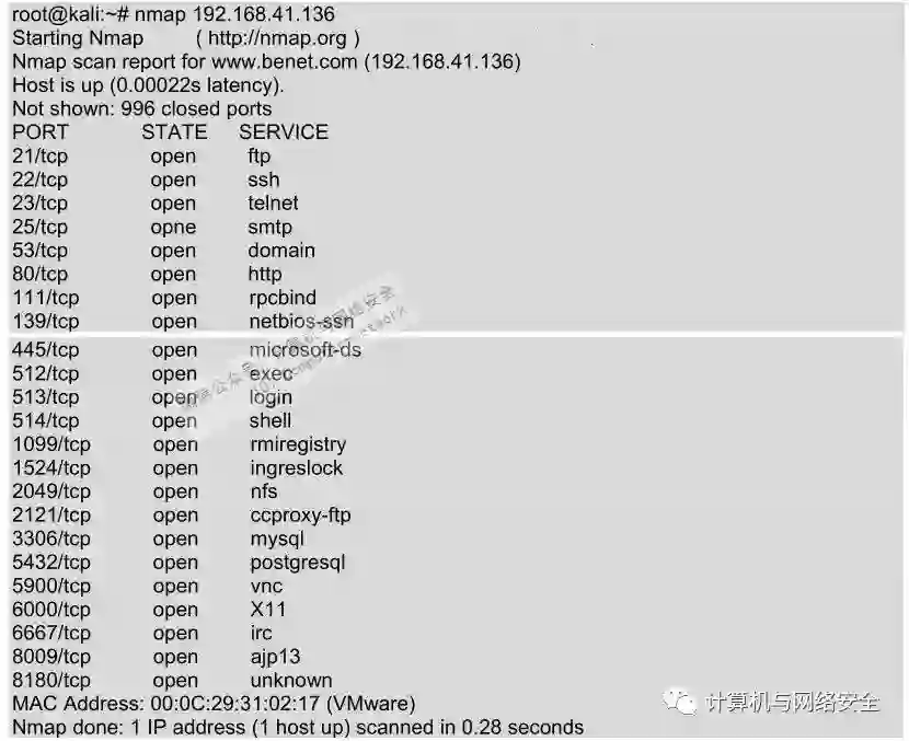 输出信息显示了192.168.41.138主机打开的端口。如21、25、80和443,总共打开了4个端口号。