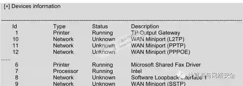 以上信息显示了该系统中所有设备相关信息,如打印设备、网络设备和处理器等。