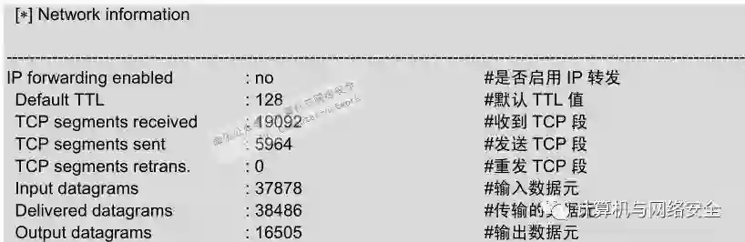 以上信息显示了该目标系统中网络的相关信息,如默认TTL值、收到TCP段、发送TCP段和重发TCP段等。