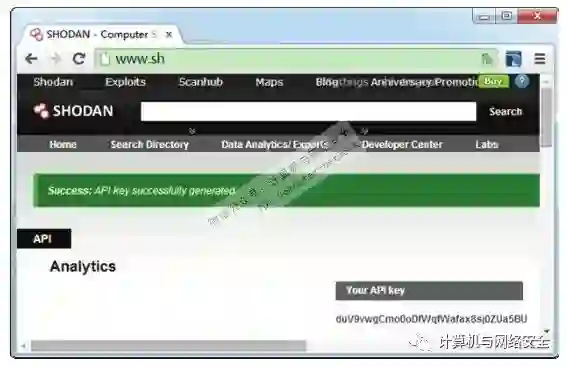 (2)从http://www.shodanhq.com/api_doc网站获取API key,获取界面如图8所示。获取API key,为了在后面使用。
