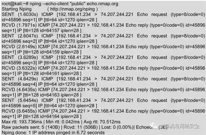 (2)使用sr()函数实现发送和接收数据包。执行命令如下所示: