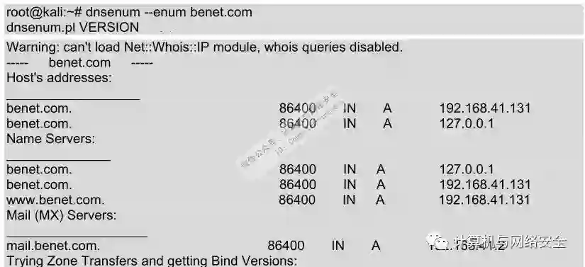 DNSenum是一款非常强大的域名信息收集工具。它能够通过谷歌或者字典文件猜测可能存在的域名,并对一个网段进行反向查询。它不仅可以查询网站的主机地址信息、域名服务器和邮件交换记录,还可以在域名服务器上执行axfr请求,然后通过谷歌脚本得到扩展域名信息,提取子域名并查询,最后计算C类地址并执行whois查询,执行反向查询,把地址段写入文件。下面介绍使用DNSenum工具检查DNS枚举。在终端执行如下所示的命令: