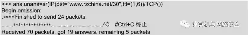 执行以上命令后,会自动与 www.rzchina.net 建立连接。执行几分钟后,使用 Ctrl+C终止接收数据包。从输出的信息中可以看到收到70个数据包,得到19个响应包及保留了5个包。