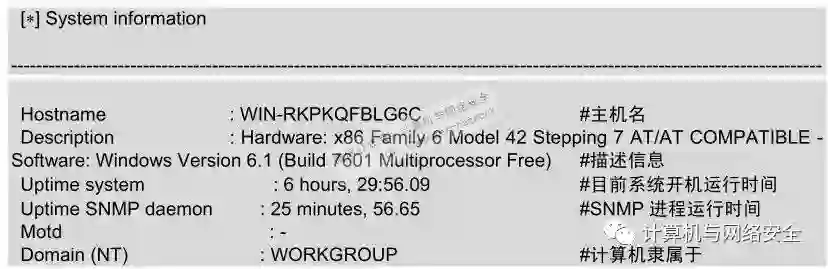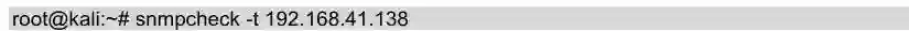 Snmpcheck工具允许用户枚举SNMP设备的同时将结果以可读的方式输出。下面演示该工具的使用。使用Snmpcheck工具通过SNMP协议获取192.168.41.138主机信息。执行命令如下所示: