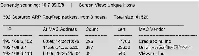 从输出的信息中,可以看到扫描到了三台主机。其 IP 地址分别为192.168.6.102、192.168.6.1和192.168.6.110。