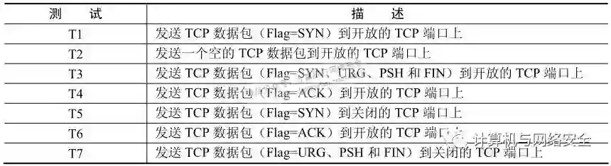 Nmap使用TCP/IP协议栈指纹准确地判断目标主机的操作系统类型。首先,Nmap通过对目标主机进行端口扫描,找出有哪些端口正在目标主机上监听。当侦测到目标主机上有多于一个开放的TCP端口、一个关闭的TCP端口和一个关闭的UDP端口时,Nmap的探测能力是最好的。Nmap工具的工作原理如表1所示。