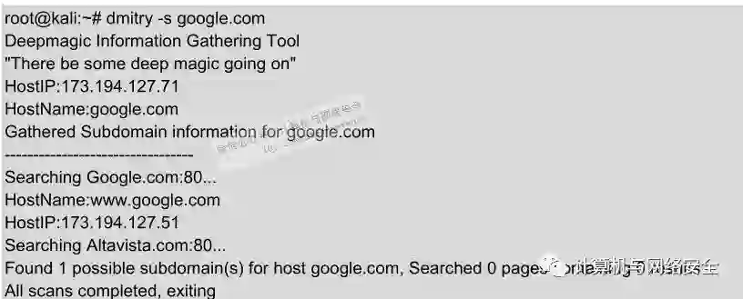 以上信息显示了dmitry命令的语法格式和所有可用参数。下面使用dmitry命令的-s选项,查询合理的子域。执行命令如下所示: