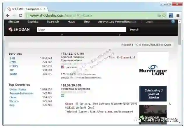 如果要搜索一些东西时,在Shodan对应的文本框中输入搜索的内容。然后,单击Search按钮开始搜索。例如,想要搜索思科路由器,则在搜索框中输入Cisco,并单击Search按钮。搜索到结果后,显示界面如图6所示。