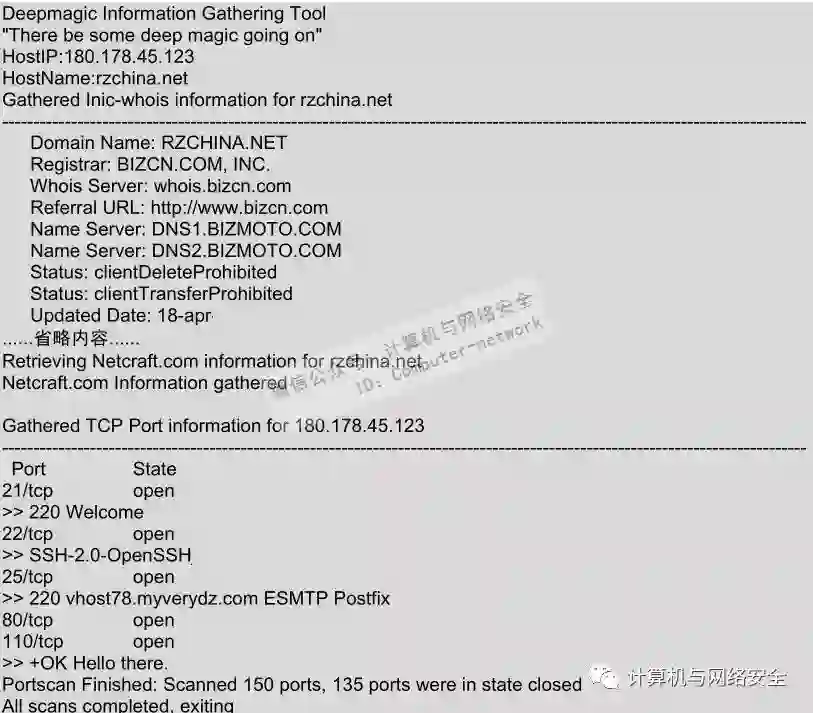 输出的信息显示了rzchina.net域名的IP地址、WHOIS信息及开放的端口号等。执行以上命令后输出的信息很多,但是由于篇幅的原因,部分内容使用省略号(......)代替。