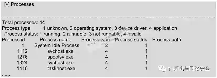 输出信息的第一行表示该系统中共有44个进程。由于篇幅的原因,这里只列出了前几个运行的进程。第二行指定了进程类型:1表示不知名;2表示操作系统;3表示设备驱动;4表示应用程序。第三行指定了进程的状态:1表示正在运行;2表示可以运行;3表示不能运行;4表示无效的。第四行的内容是以列的形式显示:第一列表示进程ID;第二列表示进程名;第三列表示进程状态;第四列表示进程路径。