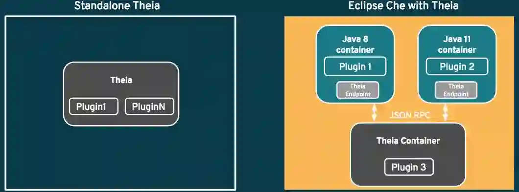 Eclipse Che 是一个使用容器技术的开发者工具。Theia 插件使用 TypeScript/JavaScript 编写,二者兼容非常好。但是插件作者有时候需要一些额外的依赖,这些依赖不一定存在于 npmjs 中。例如,如果开发者为 Java 编写一个语言服务器,那么插件就需要 Java 的支持。因此这就可能会影响运行了 Eclipse Theia 的容器,容器本身也需要提供 Java 的支持。