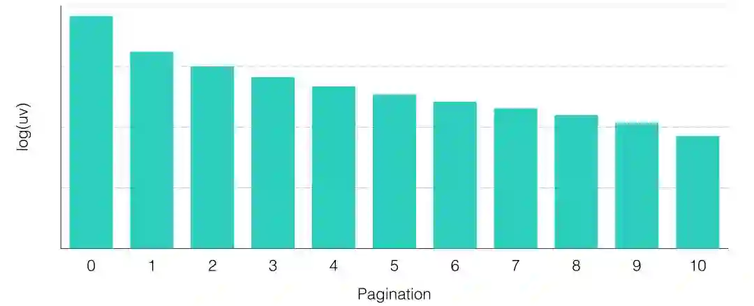 在“猜你喜欢“展位中,用户可以通过翻页来实现与推荐系统的多轮交互,此过程中推荐系统能够感知用户的实时行为,从而更加理解用户,在接下来的交互中提供更好的体验。“猜你喜欢”用户-翻页次数的分布是一个长尾的分布,在下图中我们把用户数取了对数。可知多轮交互确实天然存在于推荐场景中。