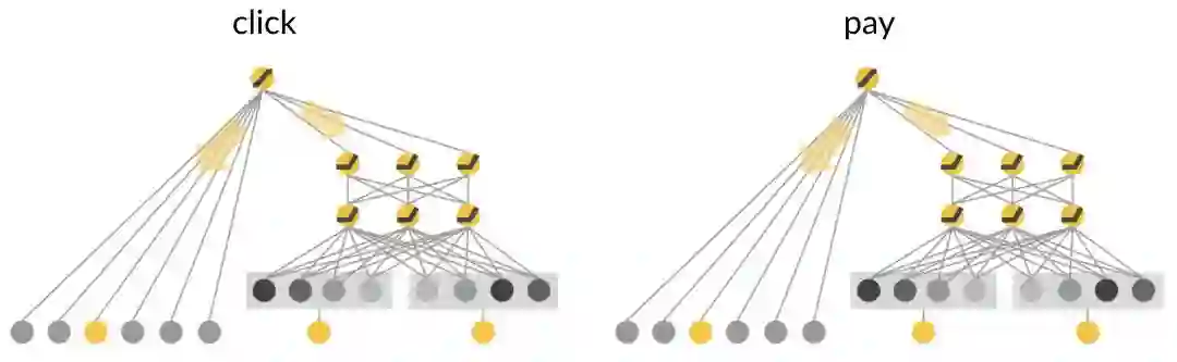 “猜你喜欢”目前使用的排序模型由两个同构的Wide&Deep模型组成,分别以点击和支付作为目标训练,最后把两个模型的输出做融合。融合方法如下图所示: