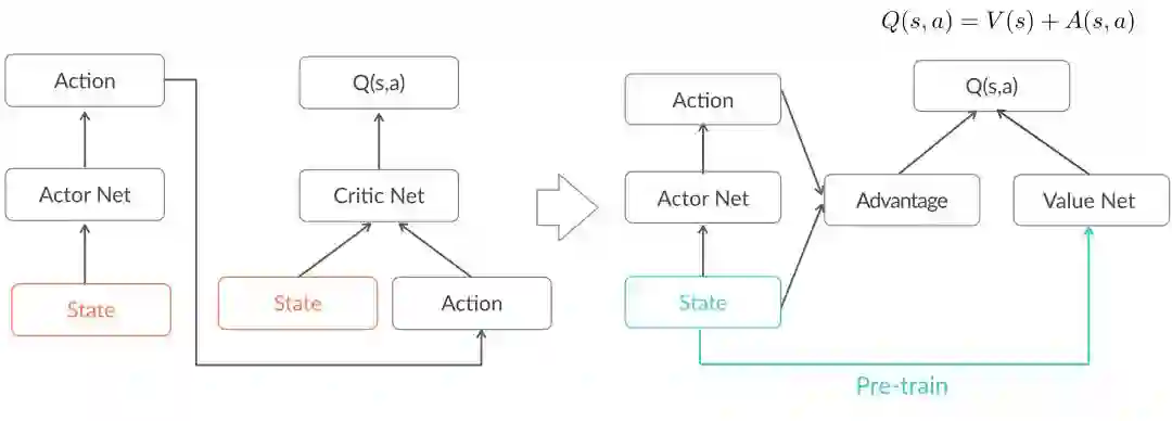 借鉴DDQN[5]的优势函数Advantage的思路,我们把critic估计的Q(s,a)拆分成两个部分:只与状态相关的V(s),与状态、动作都相关的Advantage函数A(s,a),有Q(s,a) = V(s) + A(s,a),这样能够缓解critic对Q过高估计的问题。具体到推荐环境中,我们的策略只是对排序模型的融合参数做调整,收益主要是由状态决定的。