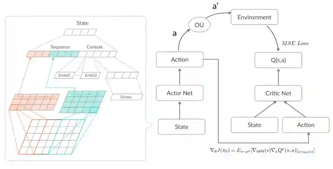 如上图所示,基本的DDPG是Actor-Critic架构。线上使用Actor网络,预测当前State下最好的动作a,并通过Ornstein-Uhlenbeck过程对预测的Action加一个随机噪声得到a',从而达到在最优策略附近探索的目的。将a' 作用于线上,并从用户(Environment)获得相应的收益。训练过程中,Critic学习估计当前状态s下采取动作a获得的收益,使用MSE作为Loss Function: