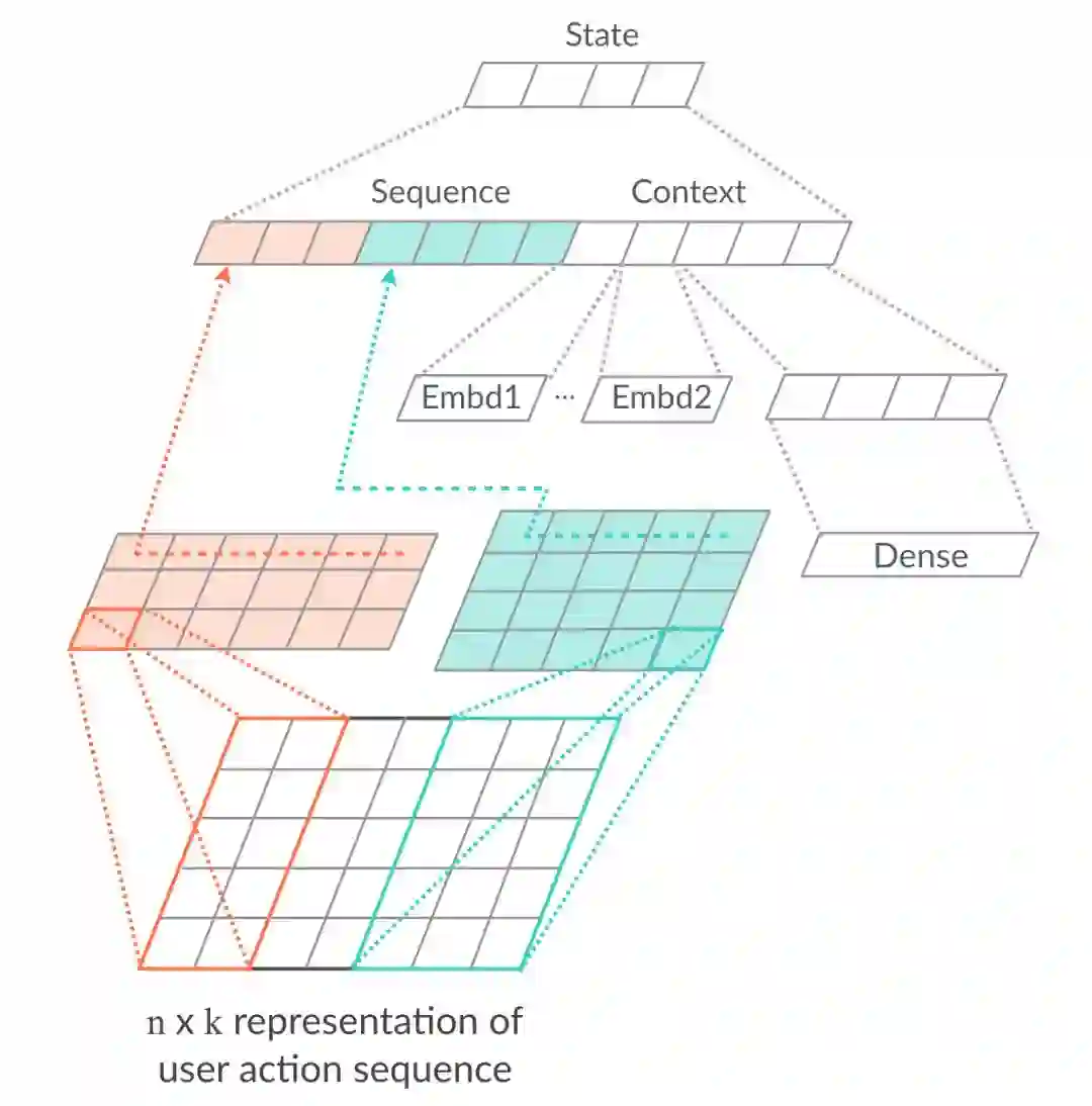 状态来自于Agent对Environment的观察,在推荐场景下即用户的意图和所处场景,我们设计了下图所示的网络结构来提取状态的表达。网络主要分为两个部分:把用户实时行为序列的Item Embedding作为输入,使用一维CNN学习用户实时意图的表达;推荐场景其实仍然相当依赖传统特征工程,因此我们使用Dense和Embedding特征表达用户所处的时间、地点、场景,以及更长时间周期内用户行为习惯的挖掘。