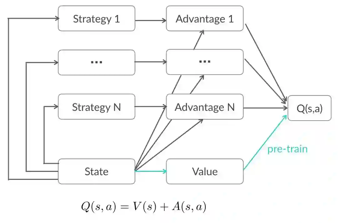 如图所示,线上多组实验共享State表达和V(s)的估计,每个策略训练自己的A(s,a)网络且能快速收敛,这样的结构一方面使训练过程更加稳定,另一方面为强化学习策略全量提供了可能性。