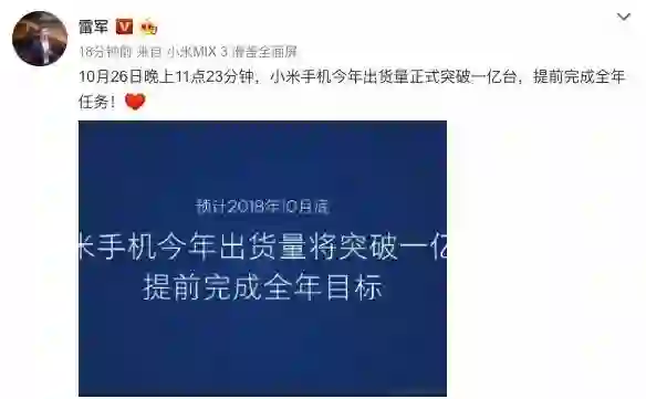 今天,雷军发布微博称,10月26日晚上11点23分钟,小米手机今年出货量正式突破一亿台,提前完成全年任务。