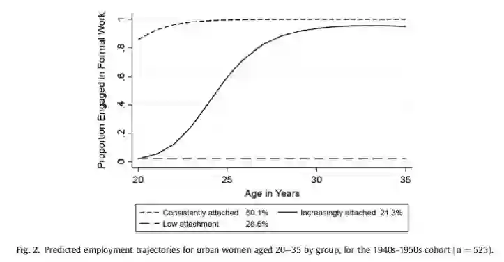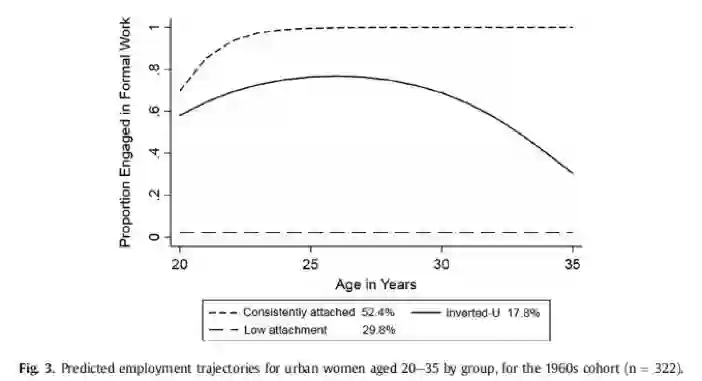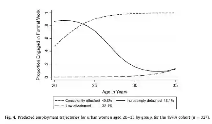 市场转型也扩大了社会阶层间的不平等,而少有研究进一步分析不同女性群体间“生育代价”的差异(於嘉、谢宇,2014)。处于不同社会阶层的女性,拥有不同的资源和机会,面临不同程度的困境,因此转型期间女性的经历不能一概而论。我和合作者最近发表的一项研究(Sunand Chen, 2017),运用2008年中国综合社会调查(CGSS)中的工作史数据,考察了三代(40-50后、60后、70后)城镇青年女性从20到35岁的正式就业轨迹在社会经济转型的不同时期如何变化,以及不同就业轨迹和初婚年龄、所处社会阶层之间的关系。