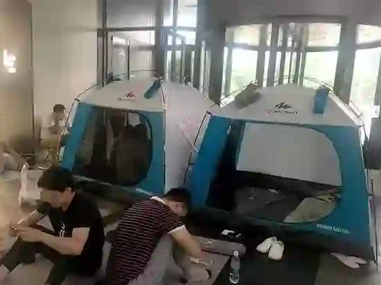 此前躺在乐视大厦前讨债的乐视供应商,已经升级了装备。7月19日,乐视大厦前台前有债主在瑜伽垫上搭起帐篷。据悉,已有8名债主在帐篷里睡了一夜。他们也去了周一乐视网临时股东大会。据了解,想出搭帐篷要债“怪招”的乐视债主,和前段时间躺在乐视大厦前台前的债主是同一拨人。