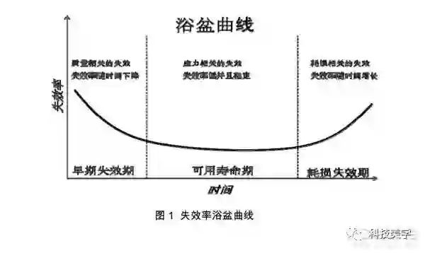 有关芯片寿命的过程是一条浴盆曲线,整个寿命可以分为早期失效期、可用寿命期和耗损寿命期,中间的可用寿命期中,失效率是最低的,而且通常比较稳定,前期、后期的失效率就比较高了,所以这个曲线的特征是两边高,中间低,很像洗澡用的浴盆,浴盆曲线得名也是因此而来。