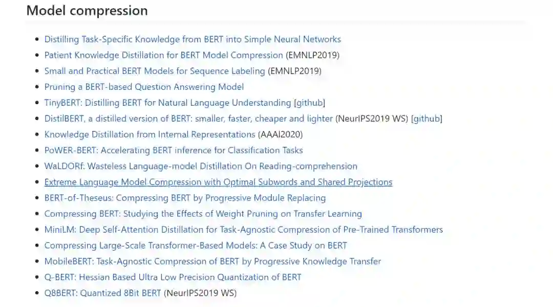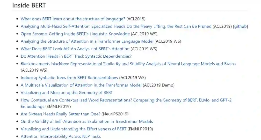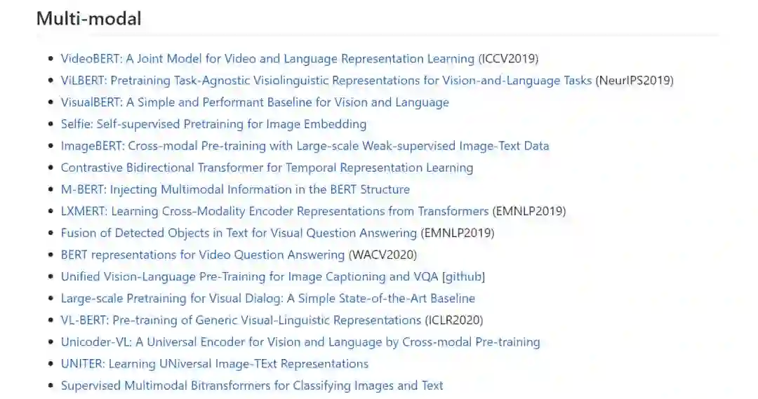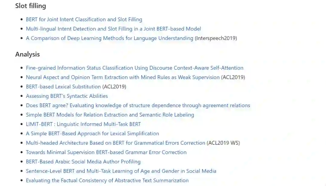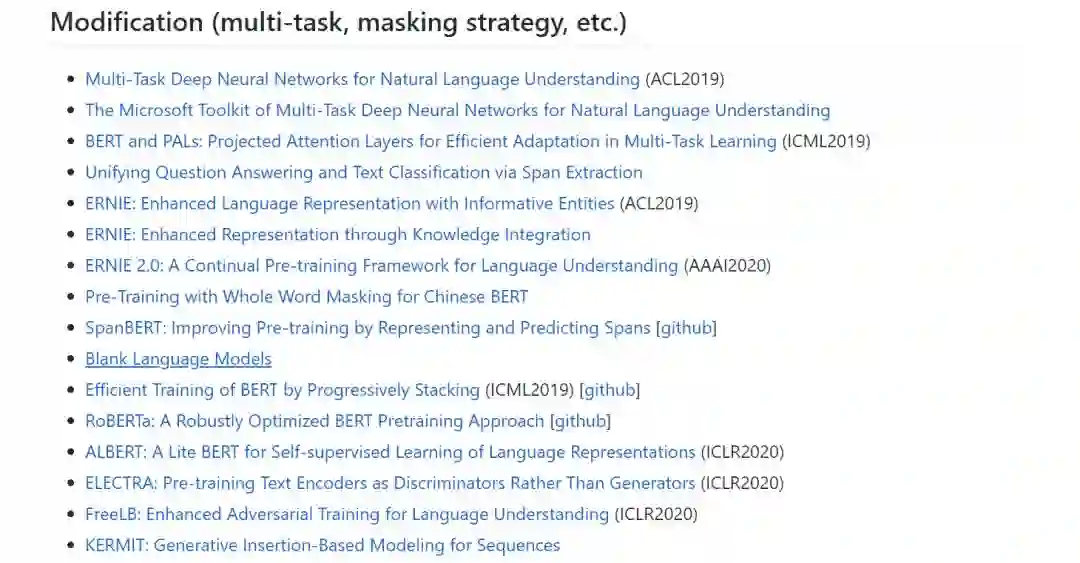 本资源整理了与BERT相关的论文,并按应用类别进行分类,包括:Downstream task、Generation、Modification (multi-task, masking strategy, etc.)、Transformer variants、Probe、Inside BERT、Multi-lingual(多语言)、Other than English models(英语以外的模型)、Domain specific(特定领域)、Multi-modal(多模态)、Model compression(模型压缩)、Misc(其他混杂论文)。