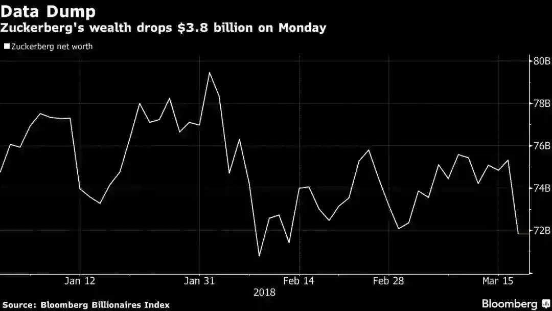 Facebook股价3月19日下跌6.8%至172.56美元,彭博亿万富豪指数显示,扎克伯格的财富降至704亿美元,其排名下降一位,至第五,仅次于贝佐斯、比尔·盖茨、沃伦·巴菲特和Amancio Ortega。